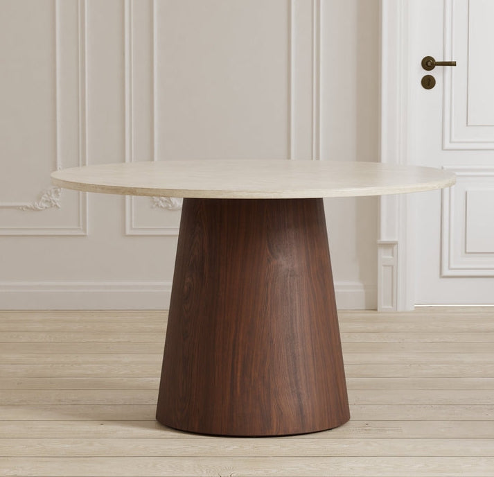 Stilingas Lanzo apvalus valgomojo stalas išsiskiria švariu dizainu, idealiai tinkančiu jaukiems valgymams ir pokalbiams. Šiltas mocha atspalvio pagrindas derinamas su šviesiu, travertino įkvėptu stalviršiu, sukuriant modernų ir elegantišką kontrastą. Apvali forma kuria kviečiančią atmosferą ir leidžia patogiai susiburti aplink stalą.